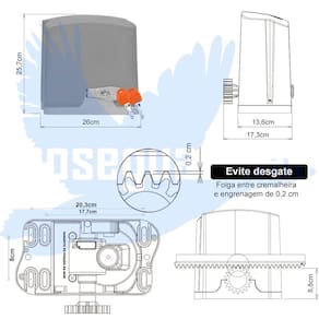 ITENS INCLUSOS 01 Motor DZ Rio R700 Z18 1/2 HP PPA 01 Placa eletrônica de comando PPA (testada e codificada com os controles) 01 Conjunto de Sensor fim de curso (Instalado) 02 Ímãs com suporte para o sensor fim de curso 04 Metros de cremalheira (50cm cada barra) 02 Controles remotos PPA 433Mhz (testada e codificada com a Placa de Comando) 01 Manual de operações