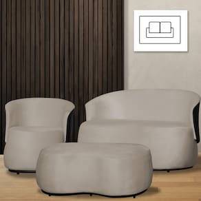 Kit 1 Poltrona 1 Namoradeira e 1 Puff Grande Decorativo Estilo Orgânico Beatriz Suede Composê Corino Preto - Estopar - Bege