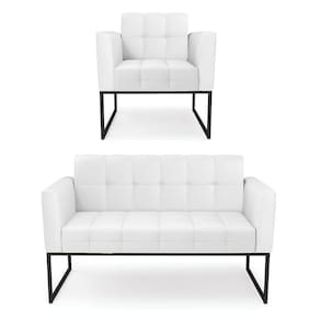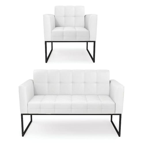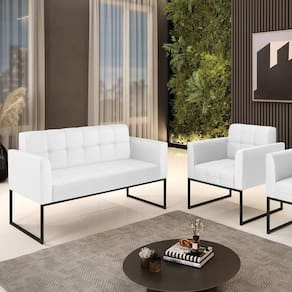 Você gosta de colecionar vários momentos memoráveis com sua família e amigos? Que tal recebê-los, com móveis de altíssima qualidade que só a DRossi tem? O Kit 01 Namoradeira e 01 Poltrona Elisa é adequado para você! Seu design retrô é a grande tendência do momento. Pode ser utilizado em diversos espaços da casa, em salas, hall de entrada, quartos, cozinhas, varanda, sacada, escritório, dentre outros. Contém as seguintes características: A estrutura é feita de madeira de Eucalipto 100% de reflorestamento, e a Base Metálica Industrial Preto, além de ser resistente e durável, suporta em média até 120 kg. Assento, encosto e braços, contém enchimento de espuma D-23 e é estofado em tecido Corino, no tom Branco, que oferece muito conforto e resistência ao sentar, com aquela sensação de maciez e aconchego. Possui também, detalhes de costura no encosto e assento, resultando em um acabamento impecável, conferindo muito mais valor e elegância ao seu espaço. Para complementar a decoração com esse lindo kit, a dica é utilizar mantas, almofadas ou vasinho de flor. E pronto, seu cantinho estará perfeito para descansar e relaxar! Aqui, você encontra várias opções, para que seus amigos e familiares se sintam acolhidos. Garanta já seu kit.