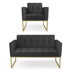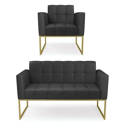 Você gosta de colecionar vários momentos memoráveis com sua família e amigos? Que tal recebê-los, com móveis de altíssima qualidade que só a DRossi tem? O Kit 01 Namoradeira e 01 Poltrona Elisa é adequado para você! Seu design retrô é a grande tendência do momento. Pode ser em diversos espaços da casa, em salas, hall de entrada, quartos, cozinhas, varanda, ada, escritório, dentre outros. Contém as seguintes características: A estrutura é feita de madeira de Eucalipto 100% de reflorestamento, e a Base Metálica Industrial Dourado, além de ser resistente e durável, suporta em média até 120 kg. Assento, encosto e braços, contém enchimento de espuma D-23 e é estofado em tecido Corino, no tom Preto, que oferece muito conforto e resistência ao sentar, com aquela sensação de maciez e aconchego. Possui também, detalhes de costura no encosto e assento, resultando em um acabamento impecável, conferindo muito mais valor e elegância ao seu espaço. Para complementar a decoração com esse lindo kit, a dica é utilizar mantas, almofadas ou vasinho de flor. E pronto, seu cantinho estará perfeito para descansar e relaxar! Aqui, você encontra várias opções, para que seus amigos e familiares se sintam acolhidos. Garanta já seu kit.
