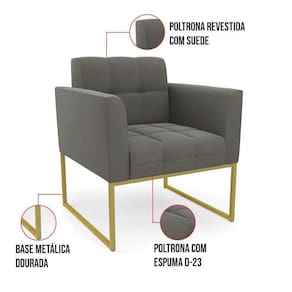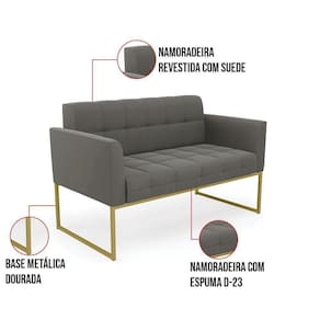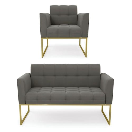 Você gosta de colecionar vários momentos memoráveis com sua família e amigos? Que tal recebê-los, com móveis de altíssima qualidade que só a DRossi tem? O Kit 01 Namoradeira e 01 Poltrona Elisa é adequado para você! Seu design retrô é a grande tendência do momento. Pode ser em diversos espaços da casa, em salas, hall de entrada, quartos, cozinhas, varanda, sacada, escritório, dentre outros. Contém as seguintes características: A estrutura é feita de madeira de Eucalipto 100% de reflorestamento, e a Base Industrial Metálica Dourada, além de ser resistente e durável, suporta em média até 120 kg. Assento, encosto e braços, contém enchimento de espuma D-23 e é estofado em tecido Suede, no tom Grafite, que oferece muito conforto e resistência ao sentar, com aquela sensação de maciez e aconchego. Possui também, detalhes de costura no encosto e assento, resultando em um acabamento impecável, conferindo muito mais valor e elegância ao seu espaço. Para complementar a decoração com esse lindo kit, a dica é utilizar mantas, almofadas ou vasinho de flor. E pronto, seu cantinho estará perfeito para descansar e relaxar! Aqui, você encontra várias opções, para que seus amigos e familiares se sintam acolhidos. Garanta já seu kit.