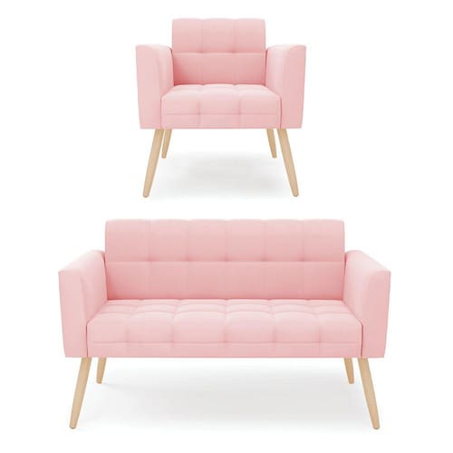 Você gosta de colecionar vários momentos memoráveis com sua família e amigos? Que tal recebê-los, com móveis de altíssima qualidade que só a D'Rossi tem? O Kit 01 Namoradeira e 01 Poltrona Elisa é adequado para você! Seu design retrô é a grande tendência do momento. Pode ser utilizado em diversos espaços da casa, em salas, hall de entrada, quartos, cozinhas, varanda, sacada, escritório, dentre outros. Contém as seguintes características: A estrutura é feita de madeira de Eucalipto 100% de reflorestamento, e os Pés Palito Natural, além de serem resistentes e duráveis, suportam em média até 120 kg. Assento, encosto e braços, contém enchimento de espuma D-23 e é estofado em tecido Suede, no tom Rosa Bebê, que oferece muito conforto e resistência ao sentar, com aquela sensação de maciez e aconchego. Possui também, detalhes de costura no encosto e assento, resultando em um acabamento impecável, conferindo muito mais valor e elegância ao seu espaço. Para complementar a decoração com esse lindo kit, a dica é utilizar mantas, almofadas ou vasinho de flor. E pronto, seu cantinho estará perfeito para descansar e relaxar! Aqui, você encontra várias opções, para que seus amigos e familiares se sintam acolhidos. Garanta já seu kit.