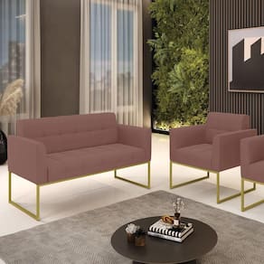 Você gosta de colecionar vários momentos memoráveis com sua família e amigos? Que tal recebê-los, com móveis de altíssima qualidade que só a DRossi tem? O Kit 01 Namoradeira e 01 Poltrona Elisa é adequado para você! Seu design retrô é a grande tendência do momento. Pode ser utilizado em diversos espaços da casa, em salas, hall de entrada, quartos, cozinhas, varanda, sacada, escritório, dentre outros. Contém as seguintes características: A estrutura é feita de madeira de Eucalipto 100% de reflorestamento, e a Base Metálica Industrial Dourado, além de ser resistente e durável, suporta em média até 120 kg. Assento, encosto e braços, contém enchimento de espuma D-23 e é estofado em tecido Veludo, no tom Rosê, que oferece muito conforto e resistência ao sentar, com aquela sensação de maciez e aconchego. Possui também, detalhes de costura no encosto e assento, resultando em um acabamento impecável, conferindo muito mais valor e elegância ao seu espaço. Para complementar a decoração com esse lindo kit, a dica é utilizar mantas, almofadas ou vasinho de flor. E pronto, seu cantinho estará perfeito para descansar e relaxar! Aqui, você encontra várias opções, para que seus amigos e familiares se sintam acolhidos. Garanta já seu kit.