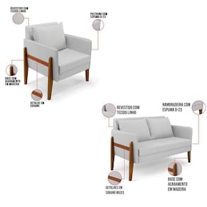 Ter uma casa com móveis de qualidade e que dure por anos é o sonho de qualquer pessoa. Afinal, quem não gosta de estar em um ambiente que transmita a sensação de acolhimento não é mesmo? Com este Kit 01 Namoradeira e 01 Poltrona Lana, você consegue levar aconchego e leveza a qualquer ambiente. Confeccionado em madeira de eucalipto proveniente de reflorestamento, suportando em média até 120 Kg, garantindo uma maior resistência e Linho no tom Cinza, o estofamento do assento e encosto é composto de espuma D-23, na lateral vem com uma tira de corano, que dá um charme todo especial ao produto. Olha só que legal, as almofadas soltas além de serem totalmente confortáveis e extremamente macias, dão a opção de mudar a cara do ambiente quando quiser. Então, que tal aproveitar a nossa super novidade? Aproveite!