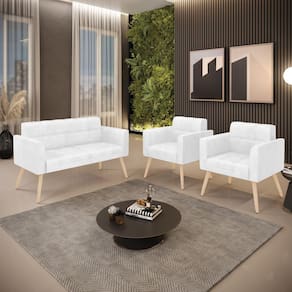 Você gosta de colecionar vários momentos memoráveis com sua família e amigos? Que tal recebê-los, com móveis de altíssima qualidade que só a D'Rossi tem? O Kit 01 Namoradeira e 02 Poltronas Elisa é adequado para você! Seu design retrô é a grande tendência do momento. Pode ser utilizado em diversos espaços da casa, em salas, hall de entrada, quartos, cozinhas, varanda, sacada, escritório, dentre outros. Contém as seguintes características: A estrutura é feita de madeira de Eucalipto 100% de reflorestamento, e os Pés Palito Natural, além de serem resistentes e duráveis, suportam em média até 120 kg. Assento, encosto e braços, contém enchimento de espuma D-23 e é estofado em tecido Corano, no tom Branco, que oferece muito conforto e resistência ao sentar, com aquela sensação de maciez e aconchego. Possui também, detalhes de costura no encosto e assento, resultando em um acabamento impecável, conferindo muito mais valor e elegância ao seu espaço. Para complementar a decoração com esse lindo kit, a dica é utilizar mantas, almofadas ou vasinho de flor. E pronto, seu cantinho estará perfeito para descansar e relaxar! Aqui, você encontra várias opções, para que seus amigos e familiares se sintam acolhidos. Garanta já seu kit.