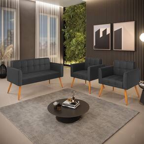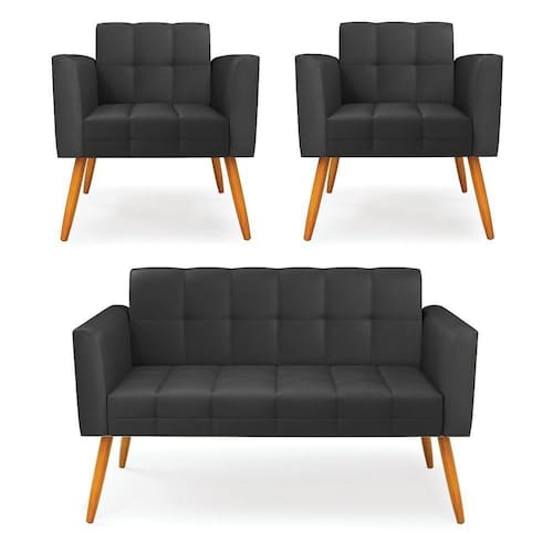 Você gosta de colecionar vários momentos memoráveis com sua família e amigos? Que tal recebê-los, com móveis de altíssima qualidade que só a DRossi tem? O Kit 01 Namoradeira e 02 Poltronas Elisa é adequado para você! Seu design retrô é a grande tendência do momento. Pode ser em diversos espaços da casa, em salas, hall de entrada, quartos, cozinhas, varanda, ada, escritório, dentre outros. Contém as seguintes características: A estrutura é feita de madeira de Eucalipto 100% de reflorestamento, e os Pés Palito Castanho, além de serem resistentes e duráveis, suportam em média até 120 kg. Assento, encosto e braços, contém enchimento de espuma D-23 e é estofado em tecido Corino, no tom Preto, que oferece muito conforto e resistência ao sentar, com aquela sensação de maciez e aconchego. Possui também, detalhes de costura no encosto e assento, resultando em um acabamento impecável, conferindo muito mais valor e elegância ao seu espaço. Para complementar a decoração com esse lindo kit, a dica é utilizar mantas, almofadas ou vasinho de flor. E pronto, seu cantinho estará perfeito para descansar e relaxar! Aqui, você encontra várias opções, para que seus amigos e familiares se sintam acolhidos. Garanta já seu kit.