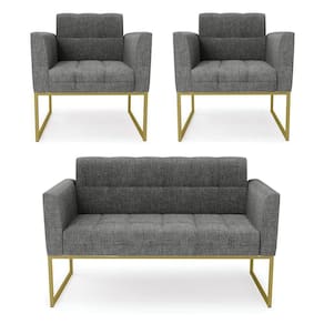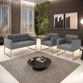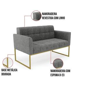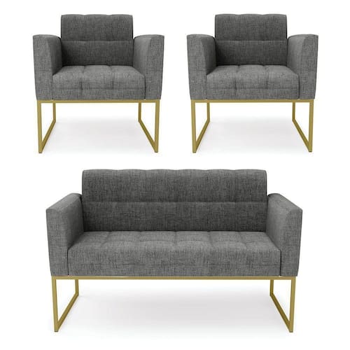 Você gosta de colecionar vários momentos memoráveis com sua família e amigos? Que tal recebê-los, com móveis de altíssima qualidade que só a DRossi tem? O Kit 01 Namoradeira e 02 Poltronas Elisa é adequado para você! Seu design retrô é a grande tendência do momento. Pode ser em diversos espaços da casa, em salas, hall de entrada, quartos, cozinhas, varanda, sacada, escritório, dentre outros. Contém as seguintes características: A estrutura é feita de madeira de Eucalipto 100% de reflorestamento, e a Base Industrial Metálica Dourada, além de ser resistente e durável, suporta em média até 120 kg. Assento, encosto e braços, contém enchimento de espuma D-23 e é estofado em tecido Linho, no tom Grafite, que oferece muito conforto e resistência ao sentar, com aquela sensação de maciez e aconchego. Possui também, detalhes de costura no encosto e assento, resultando em um acabamento impecável, conferindo muito mais valor e elegância ao seu espaço. Para complementar a decoração com esse lindo kit, a dica é utilizar mantas, almofadas ou vasinho de flor. E pronto, seu cantinho estará perfeito para descansar e relaxar! Aqui, você encontra várias opções, para que seus amigos e familiares se sintam acolhidos. Garanta já seu kit.