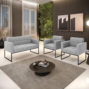 Você gosta de colecionar vários momentos memoráveis com sua família e amigos? Que tal recebê-los, com móveis de altíssima qualidade que só a DRossi tem? O Kit 01 Namoradeira e 02 Poltronas Elisa é adequado para você! Seu design retrô é a grande tendência do momento. Pode ser em diversos espaços da casa, em salas, hall de entrada, quartos, cozinhas, varanda, sacada, escritório, dentre outros. Contém as seguintes características: A estrutura é feita de madeira de Eucalipto 100% de reflorestamento, e a Base Industrial Metálica Preto, além de ser resistente e durável, suporta em média até 120 kg. Assento, encosto e braços, contém enchimento de espuma D-23 e é estofado em tecido Suede, no tom Cinza, que oferece muito conforto e resistência ao sentar, com aquela sensação de maciez e aconchego. Possui também, detalhes de costura no encosto e assento, resultando em um acabamento impecável, conferindo muito mais valor e elegância ao seu espaço. Para complementar a decoração com esse lindo kit, a dica é utilizar mantas, almofadas ou vasinho de flor. E pronto, seu cantinho estará perfeito para descansar e relaxar! Aqui, você encontra várias opções, para que seus amigos e familiares se sintam acolhidos. Garanta já seu kit.