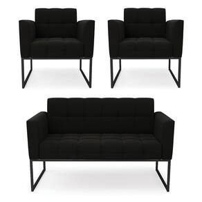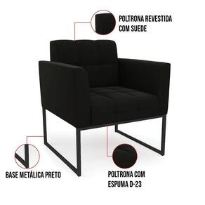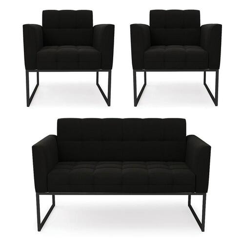 Você gosta de colecionar vários momentos memoráveis com sua família e amigos? Que tal recebê-los, com móveis de altíssima qualidade que só a DRossi tem? O Kit 01 Namoradeira e 02 Poltronas Elisa é adequado para você! Seu design retrô é a grande tendência do momento. Pode ser utilizado em diversos espaços da casa, em salas, hall de entrada, quartos, cozinhas, varanda, sacada, escritório, dentre outros. Contém as seguintes características: A estrutura é feita de madeira de Eucalipto 100% de reflorestamento, e a Base Industrial Metálica Preto, além de ser resistente e durável, suporta em média até 120 kg. Assento, encosto e braços, contém enchimento de espuma D-23 e é estofado em tecido Suede, no tom Preto, que oferece muito conforto e resistência ao sentar, com aquela sensação de maciez e aconchego. Possui também, detalhes de costura no encosto e assento, resultando em um acabamento impecável, conferindo muito mais valor e elegância ao seu espaço. Para complementar a decoração com esse lindo kit, a dica é utilizar mantas, almofadas ou vasinho de flor. E pronto, seu cantinho estará perfeito para descansar e relaxar! Aqui, você encontra várias opções, para que seus amigos e familiares se sintam acolhidos. Garanta já seu kit.