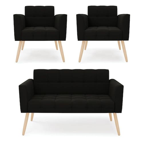 Você gosta de colecionar vários momentos memoráveis com sua família e amigos? Que tal recebê-los, com móveis de altíssima qualidade que só a DRossi tem? O Kit 1 Namoradeira 2 Lugares e 2 Poltronas Elisa é adequado para você! Seu design retrô é a grande tendência do momento. Pode ser em diversos espaços da casa, em salas, hall de entrada, quartos, cozinhas, varanda, sacada, escritório, dentre outros. Contém as seguintes características: A estrutura é feita de madeira de Eucalipto 100% de reflorestamento, e os Pés Palito , além de serem resistentes e duráveis, suportam em média até 120 kg. Assento, encosto e braços, contém enchimento de espuma D-23 e é estofado em tecido Suede, no tom Preto, que oferece muito conforto e resistência ao sentar, com aquela sensação de maciez e aconchego. Possui também, detalhes de costura no encosto e assento, resultando em um acabamento impecável, conferindo muito mais valor e elegância ao seu espaço. Para complementar a decoração com esse lindo kit, a dica é utilizar mantas, almofadas ou vasinho de flor. E pronto, seu cantinho estará perfeito para descansar e relaxar! Aqui, você encontra várias opções, para que seus amigos e familiares se sintam acolhidos. Garanta já seu kit.