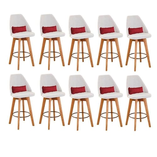 Kit 10 Banquetas Alta Maya Giratória Com Encosto Linho Bege Claro E Almofada Corino Vermelho - Gat Magazine Banqueta Maya Giratória - GAT MAGAZINE A Banqueta Maya possui assento e pés em madeira eucalipto com sistema giratório! Os pés contam com um reforço que proporciona um suporte de peso de até 120 Kgs.O assento é revestido com espuma D-23. Além de bonita e charmosa, vai trazer para seu ambiente elegância e proporcionará conforto para sua família e amigos nos momentos de lazer.