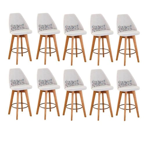 Kit 10 Banquetas Alta Maya Giratória Com Encosto Linho Bege Claro E Almofada Flores - Gat Magazine Banqueta Maya Giratória - GAT MAGAZINE A Banqueta Maya possui assento e pés em madeira eucalipto com sistema giratório! Os pés contam com um reforço que proporciona um suporte de peso de até 120 assento é revestido com espuma D-23. Além de bonita e charmosa, vai trazer para seu ambiente elegância e proporcionará conforto para sua família e amigos nos momentos de lazer.