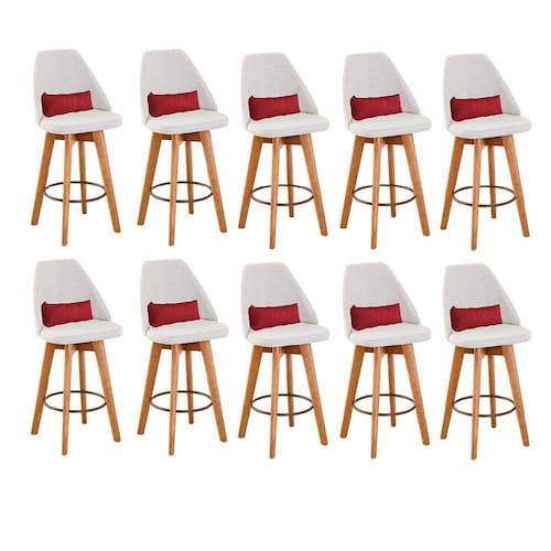 Kit 10 Banquetas Alta Maya Giratória Com Encosto Gourmet Linho Bege E Almofada Suede Vermelho - Gat Magazine Banqueta Maya Giratória - GAT MAGAZINE A Banqueta Maya possui assento e pés em madeira eucalipto com sistema giratório! Os pés contam com um reforço que proporciona um suporte de peso de até 120 assento é revestido com espuma D-23. Além de bonita e charmosa, vai trazer para seu ambiente elegância e proporcionará conforto para sua família e amigos nos momentos de lazer.