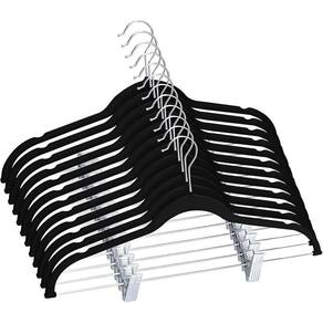 O Kit 10 Cabides Slim de Veludo Preto com 20 Presilhas é ideal para quem deseja organizar roupas de forma sofisticada e prática. Com design ultrafino e revestimento em veludo, evita que as peças escorreguem e mantém o formato dos tecidos mais delicados. As presilhas em metal cromado proporcionam maior versatilidade, permitindo pendurar calças, bermudas e saias de maneira segura. Além de compacto e resistente, seu acabamento premium garante mais espaço no armário e um toque de elegância na organização.