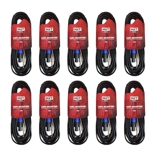 KIT 10 Cabo Speakon Macho P10 Macho MXT 10 Metros Cabo Speakon Macho para P10 Mono Metal – 10 Metros Desenvolvido para aplicações profissionais, garante conexões seguras entre amplificadores, caixas acústicas, mesas de som e sistemas de sonorização. Suporta até 1200W, oferecendo alta resistência a corrente e interferências magnéticas. Conta com conectores de qualidade premium – plug P10 mono em metal e plug Speakon macho – proporcionando durabilidade e excelente desempenho em uso contínuo.