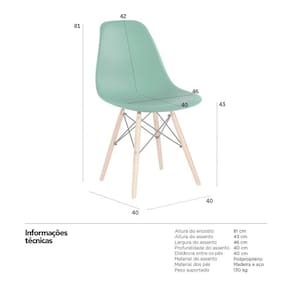 Cadeira modelo Eames DSW: Material do assento: Polipropileno - Material da base: Madeira e aço - Altura do encosto: 81 cm - Altura do assento: 43 cm - Largura do assento: 46 cm - Profundidade do assento: 40 cm - Distância entre os pés: 40 cm - Peso suportado: 130 kg - Garantia: 3 meses.