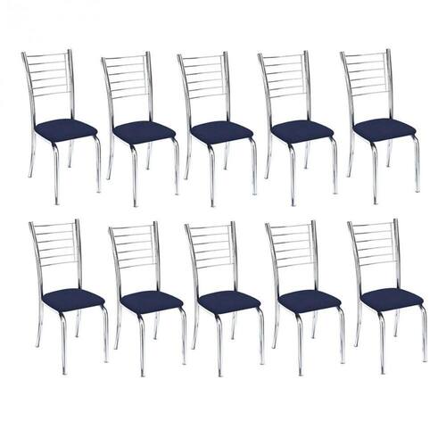 Kit 10 Cadeiras De Jantar Lara Cromada Para Cozinha Assento Corino Azul Marinho - Aurora Line