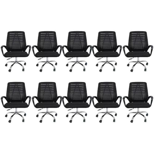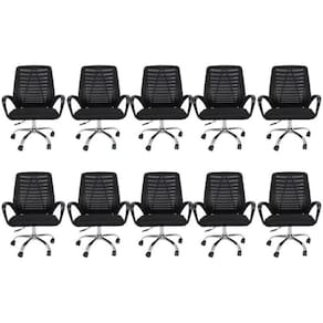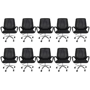 Conjunto com 10 Cadeiras office giratória com encosto em tela mesh, com braços em polipropileno e base em aço cromado. Possui regulagem de altura (mínimo 85cm e máximo 95cm), não possui função relax.