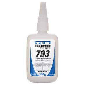 Kit 10 Cola Adesivo Instantâneo 100G Tekbond 793Cola Adesivo Instantâneo 100g Tekbond 793 com 10 unidades Adesivo Instantâneo 793 Adere diversos tipos de materiais, como compostos de borracha, EPDM, borracha nitrílica, neoprene, EVA e Viton. É um adesivo multiuso, muito utilizado no setor moveleiro e no setor industrial. CARACTERÍSTICAS:É um produto monocomponente e não requer mistura. O processo de cura inicia-se quando uma fina camada de adesivo é aplicada entre as superfícies entrando em contato com a umidade do ar atmosférico.MODO DE USO:Para obter um resultado satisfatório, as superfícies devem estar limpas, isentas de óleo e sujeira. deve-se aplicar uma camada fina de adesivo em apenas 1 um dos substratos a serem colados, pois o excesso prejudica o bom desempenho da colagem.Após a aplicação do adesivo, é preciso manter as peças pressionadas por aproximadamente 20 segundos, quando a cura inicial estará concluída e a peça poderá ser manuseada com segurança. A cura total ocorrerá em 24 horas.Este adesivo é indicado para folgas de até 0,10mm. PRECAUÇÕES:O excesso de cola prejudica a colagem. Cola a pele e olhos em pouco segundos. Mantenha fora do alcance das crianças.A polimerização do cianoacrilato gera aquecimento. Dependendo da quantidade derramada sobre as roupas, a temperatura sobe o bastante podendo causar queimadura. DADOS TÉCNICOS:Viscosidade cP : 80 a 120Temperatura de Trabalho ºC : -55 a 80Preenchimento de Folgas mm : Até 0,10Resistência ao Cisalhamento Aço x Aço : 100Kgf/cm2