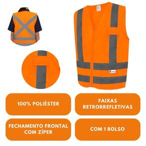 Colete de Sinalização de alta visibilidade, confeccionado em tecido 100% poliéster fluorescente com faixas reflexivas impermeáveis na parte frontal e costa, fechamento frontal em zíper. Performance de visibilidade superior para o indivíduo com o aumento da cobertura do tronco.
