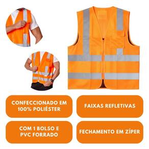 Colete de segurança confeccionado em tecido 100% poliéster fluorescente, com faixas refletivas prata, fechamento em zíper. Colete de Sinalização de alta visibilidade, sinalização de alta visibilidade.