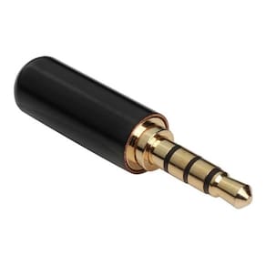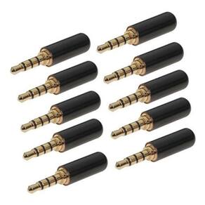 Conector P2 macho estéreo de 4 contatos, corpo de metal niquelado, capa preta, aceita cabos de 2,0 a 4,5 mm, para áudio mono ou estéreo.Plug