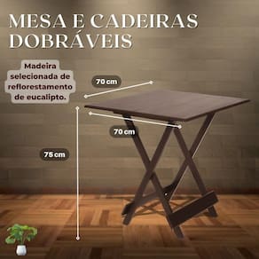 Mesa Dobrável 70x70 com 4 Cadeiras 10 JOGOS - Estrutura da Mesa, fabricada com madeira selecionada de reflorestamento de eucalipto, com tampo em MDF ULTRA PLUS, resistente a umidade. Medindo 70cm x 70cm. Dobrável, fácil e leve de carregar. As cadeiras resistentes medindo Largura das cadeiras: 38 cm, Profundidade das cadeiras: 36 cm, Altura das cadeiras: 45 cm