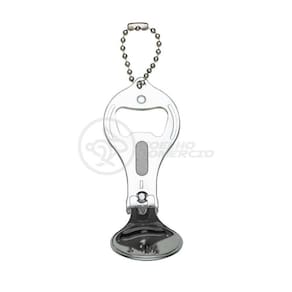 Cortador de unhas chaveiro de metal 3 em 1: abridor, cortador e lixa. Parte central circular ideal para gravações, detalhe de traços no contorno circular. Lado frontal com detalhes em relevo nas laterais e pequeno círculo acima do abridor. Para utilizar o cortador basta rotacionar a peça circular e levantá-la. Acompanha correntinha.