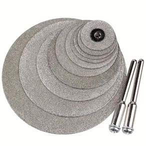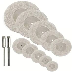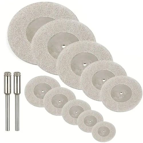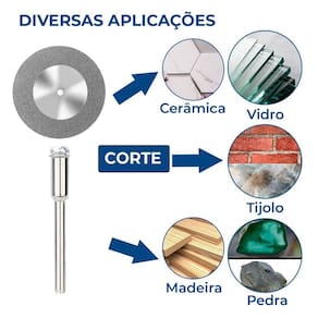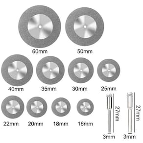 - Marca: Dremax - Referência: DCD003 - Kit com 10 discos e 2 hastes - Haste: 3mm - Diâmetros dos discos: 16mm, 18mm, 20mm, 22mm, 25mm, 30mm, 35mm, 40mm, 50mm e 60mm - Espessura dos discos: 0,7mm - Material; dos discos: Diamantado com revestimento em titânio - Indicado para micro retíficas de qualquer marca com mandril / pinça de 3mm 1/8 Pol. - Indicado para corte de porcelanato, pedras preciosas, vidro, cerâmica, rocha, mármore, telhas, alumínio e cobre - Recomenda-se corte com água para aumentar a vida útil dos discos - Revestido com partículas finas de diamante sintético em ambos os lados, bem como em torno da borda. - Super fino, para uso em lugares apertados, fazendo ranhuras e fendas e corte nivelado. - Velocidade máxima: 20,000 rpm - Garantia: 90 dias contra defeitos de fabricação Marca: Dremax
