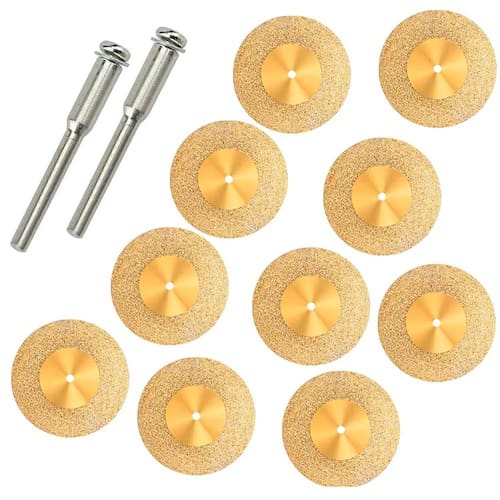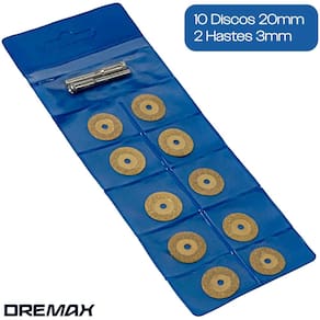 Jogo com 10 Discos de Corte 20mm Diamantado Titânio Dourado para Micro Retíficas Dremax - Marca: Dremax - Referência: JDD12-20 - Kit exclusivo com 10 discos de corte 20mm e 2 Hastes 3mm - Diâmetros dos discos: 20mm - Espessura dos discos: 0,5mm - Material: Diamantado com revestimento em titânio - Para ser acoplado suporte de discos acompanha 2 suportes com haste de 3mm - Diâmetro do furo: 2,4mm - Indicado para corte de porcelanato, pedras preciosas, vidro, cerâmica, rocha, mármore, telhas, alumínio e cobre - Recomenda-se corte com água para aumentar a vida útil dos discos - Revestido com partículas finas de diamante sintético em ambos os lados, bem como em torno da borda. - Super fino, para uso em lugares apertados, fazendo ranhuras e fendas e corte nivelado. - Velocidade máxima: 20,000 rpm - : 90 dias contra defeitos de fabricação A DREMAX é a primeira e única marca brasileira dedicada exclusivamente às micro retíficas, acessórios e acoplamentos para esta indispensável ferramenta. Seja para trabalhos de precisão, artesanato, modelagem ou reparos, a DREMAX tem o produto certo para você. Marca: Não Informado Ean: 7898752020222