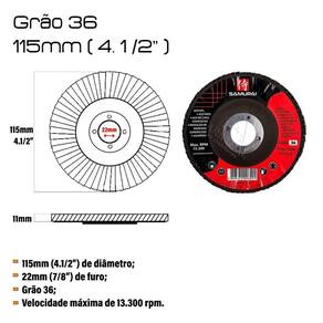 Descrição: O Disco de Lixa Flap Samurai combina desbaste e acabamento em um único produto, ideal para médias e baixas remoções. Versátil e eficiente, é perfeito para uso em lixadeiras e esmerilhadeiras angulares, proporcionando excelente desempenho em diversos materiais.