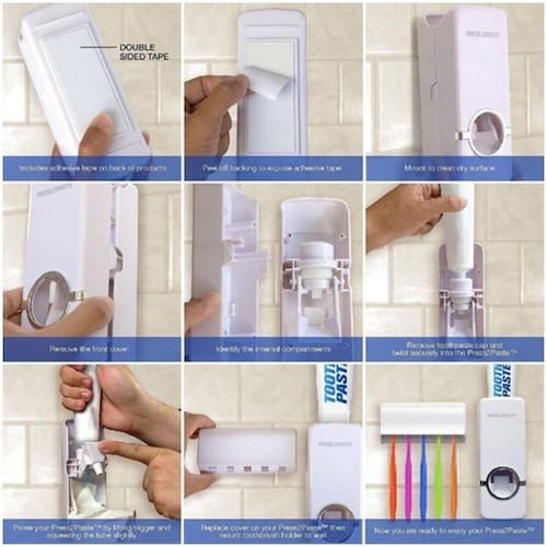 KIT 10 DISPENSER DE PASTA DE DENTE AUTOMATICO COM SUPORTE PARA 5 ESCOVA DE DENTES 2 EM 1 APLICADOR Não utiliza pilhas, acionado por mecanismo mecânico O creme dental sai automaticamente, em quantidade necessária para uma excelente escovação Utiliza um sistema de vácuo, desta maneira tira toda a pasta dentro do tubo sem a necessidade de ficar espremendo com as mãos. Para utiliza-lo basta pressionar a escova de dentes no dispenser, que o sistema de vácuo elaborado faz a pasta sair colocando-a diretamente sobre a escova, na medida certa Evita disperdícios, economizando creme dental Formato de bico universal, adaptável a todos os tipos de tubos de creme dental Acompanha porta escova, com capacidade para até 5 escovasv Mantém as escovas livre das bactérias dos banheiros Medidas dispenser 16 x 6,7 x 6 cm Medidas porta escovas - 11 x 5 x 4 cm NA