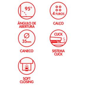 Kit 10 dobradiça curva com capa click slow renna Com amortecedor Tipo curva Copo - 35mm Angulo - 95 graus Material aço niquelado Acompanha parafusos e capa de acabamento para corpo