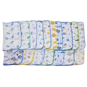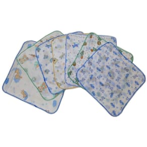 Especificações: Quantidade: 10 fraldinhas de boca estampadas Tamanho: 33x33 cm prático e compacto Composição: Tecido duplo 100% algodão duas camadas para maior resistência e absorção Acabamento: Crochê feito à máquina Principais Benefícios: