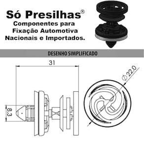 Especificação Técnica do Kit: Grampo Fabricado em Plástico de Alta Resistência Alta Durabilidade Fácil Instalação Ótimo Acabamento Encaixe Perfeito Produto Similar ao da Montadora Medidas: Corpo 31,00mm / Cabeça 22,00mm / Furo 8,30mm O Forro da Porta não acompanha o kit de fixação!
