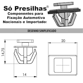 Especificação Técnica: Grampo Fabricado em Plástico de Alta Resistência Branco C/ Anel Preto Emborrachado Alta Durabilidade Fácil Instalação Ótimo Acabamento Encaixe Perfeito Produto similar ao da Montadora Medidas: Corpo 14,75mm / Cabeça 20,00mm / Furo 14,00mm Este Kit Permite a Fixação de Apenas 01 (UMA) Moldura A Moldura do Para-lama não acompanha o kit de fixação!