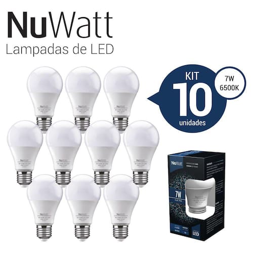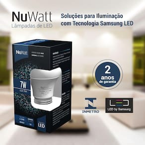 A NuWatt inova ao trazer ao mercado brasileiro a melhor tecnologia em lâmpadas de LED. As lâmpadas NuWatt proporcionam a você inúmeras vantagens, que vão desde a sua durabilidade de 25.000 horas, economia de energia e excelência na qualidade, garantida pela tecnologia Samsung LED. Além disso, as lâmpadas não emitem raios U.V e I.R. e contam com toda a segurança da certificação pelo INMETRO. De fácil instalação e sem manutenção, agora você pode contar com a melhor solução em iluminação com tecnologia Samsung aí na sua casa!_x005F_x000D__x005F_x000D_ _x005F_x000D__x005F_x000D_A NuWatt Tem:_x005F_x000D__x005F_x000D_ _x005F_x000D__x005F_x000D_• 2 ANOS DE GARANTIA (uma das maiores garantias do mercado)_x005F_x000D_• DURABILIDADE DE 25.000 HORAS_x005F_x000D_• TECNOLOGIA SAMSUNG LED INSIDE_x005F_x000D_• CERTIFICADO INMETRO_x005F_x000D__x005F_x000D_ _x005F_x000D__x005F_x000D_Informações técnicas:_x005F_x000D__x005F_x000D_ _x005F_x000D__x005F_x000D_Tensão da rede: 127-220 V_x005F_x000D_Potência: 7 W_x005F_x000D_Fluxo Luminoso: 630 lm_x005F_x000D_Eficiência Energética: 90 lm/W_x005F_x000D_Temperatura da Cor: 6.500 K_x005F_x000D_Índice de Reprodução de Cor: 80 Ra_x005F_x000D_Vida Média: 25.000 h_x005F_x000D_Frequência: 60 Hz_x005F_x000D_Corrente: 60 mA [127 V] | 36 mA [220 V]_x005F_x000D_Fator de Potência: >0,70_x005F_x000D_Base: E27_x005F_x000D_Potência Equivalente Incandescente: 40 W_x005F_x000D_Potência Equivalente Fluorescente: 13 W_x005F_x000D_Dimensões: 60 mm [D] x 110 mm [C]_x005F_x000D_Peso: 43 g Marca: NUWATT
