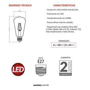 • Potência: 4W • Voltagem: 110v 220v (BIVOLT) • Dimerização: Não Dimerizável • Vida Útil: 25.000 horas • IRC: 80 • Temperatura de Cor: 2.200K (Branco Quente) • Fluxo Luminoso: 360 lúmens (lm) • Ângulo de Abertura: 360º • Fator de Potência: 0,8 • Filamento: Pêra • Soquete: E-27 (Padrão) • Cor do Soquete: Prata (Cromado) • Lente (Vidro): Âmbar