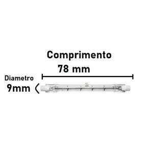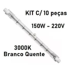 Lampada halógena palito 150w 220v 3.000k r7s - ha21511 10 unidades no kit Características: Código : ha21511 Tecnologia : halógena Tensão : 220 v Base : r7 s Potência : 150 w Temperatura de cor : 3.000 k amarela Vida mediana : 2.000 horas Dimerizável : dimerizável Comprimento : 78 mm Diâmetro : 9 mm Marca: Não Informado Ean: 7891241920331