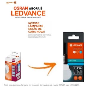 Kit 10 lampadas led cla60 9w 6500k 806lm biv e27 -osram Kit 10 lampadas led cla60 9w 6500k 806lm biv e27 - ledvance osram Substitua agora mesmo as lâmpadas antigas de sua casa ou escritório e deixe seu ambiente muito mais moderno, confortável e sustentável. Lâmpada de led bulbo cla60 e base e27, confeccionada em plástico. Produto ideal para uso em aplicações residenciais e comerciais visando iluminação geral. Indicado apenas para uso interno. Lâmpada bivolt, que se adequa às tensões de rede de 127v e 220v. Possui 9w de potência, fluxo luminoso de 806 lúmens, proporcionando uma eficiência luminosa com até 90% de economia de energia se comparada às antigas lâmpadas incandescentes. Sinta no bolso essa diferença A tradição e a qualidade das lâmpadas osram / ledvance todo mundo já sabe, elas possuem todas as certificações exigidas no brasil como o selo procel ou inmetro, sendo um produto que não gera calor ambiente, não emite radiação uv e possui acendimento instantâneo com vida útil de 25.000 horas. Características técnicas: Tipo de material: plástico, metal, vidro e componentes eletrônicos; Temperatura de cor: 6500k luz - branco fria ; Potência de consumo: 9w; Fluxo luminoso: 806 lm Irc: 80; Fator de potência: +/= 0,7; Base: e-27; Tensão de alimentação: 127/220v bivolt ; Vida útil: 25.000 hrs; Ângulo de iluminação: 180º; Temperatura de operação: -20ºc a +40ºc; Dimensões do produto: 108mm x 60mm; Peso do produto: 30 grs; Dimerizável: não Ambientes: sala, cozinha, quarto, banheiro, escritório. Área de instalação: interna. Modelo: classic a60 Marca: ledvance osram