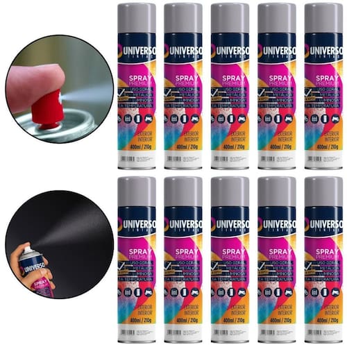 Tinta Spray 400ml Cinza Uso Geral em Aço Ferro Couro Gesso Cerâmica A Tinta Spray 400ml Cinza Uso Geral é a solução prática para renovar superfícies de metal, gesso, couro e cerâmica. Ideal para dar vida nova a bicicletas, móveis, eletrodomésticos e objetos em geral, garantindo um acabamento moderno e duradouro. Com fórmula de alta qualidade, oferece excelente aderência e acabamento Brilhante, além de resistência superior contra desgastes do dia a dia. Sua cobertura uniforme realça os detalhes e proporciona um resultado em poucas camadas. Prática e fácil de aplicar, a tinta spray seca ao toque em apenas 15 minutos, permitindo agilidade nos trabalhos e economia de tempo. O rendimento de até 2 m por demão garante maior aproveitamento do produto e ótimo custo-benefício. Diferenciais: Acabamento Brilhante com ótima aderência Alta durabilidade e resistência em ambientes internos e externos Secagem rápida e aplicação prática com cobertura uniforme Especificações TÉCNICAS: Volume: 400ml Rendimento: até 2 m por demão Superfícies indicadas: metal, gesso, couro e cerâmica Secagem: toque em 15 minutos Acabamento: Brilhante Recomendação: uso de primer para melhor desempenho Itens INCLUSOS: 10 Tintas Spray 400ml Cinza Uso Geral Marca: Não Informado