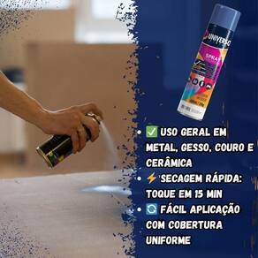 Tinta Spray 400ml Azul Escuro Uso Geral em Aço Ferro Couro Gesso Cerâmica A Tinta Spray 400ml Azul Escuro Uso Geral é a solução prática para renovar superfícies de metal, gesso, couro e cerâmica. Ideal para dar vida nova a bicicletas, móveis, eletrodomésticos e objetos em geral, garantindo um acabamento moderno e duradouro. Com fórmula de alta qualidade, oferece excelente aderência e acabamento Brilhante, além de resistência superior contra desgastes do dia a dia. Sua cobertura uniforme realça os detalhes e proporciona um resultado em poucas camadas. Prática e fácil de aplicar, a tinta spray seca ao toque em apenas 15 minutos, permitindo agilidade nos trabalhos e economia de tempo. O rendimento de até 2 m por demão garante maior aproveitamento do produto e ótimo custo-benefício. Diferenciais: Acabamento Brilhante com ótima aderência Alta durabilidade e resistência em ambientes internos e externos Secagem rápida e aplicação prática com cobertura uniforme Especificações TÉCNICAS: Volume: 400ml Rendimento: até 2 m por demão Superfícies indicadas: metal, gesso, couro e cerâmica Secagem: toque em 15 minutos Acabamento: Brilhante Recomendação: uso de primer para melhor desempenho Itens INCLUSOS: 10 Tintas Spray 400ml Azul Escuro Uso Geral Marca: Não Informado Ean: 7894141437770