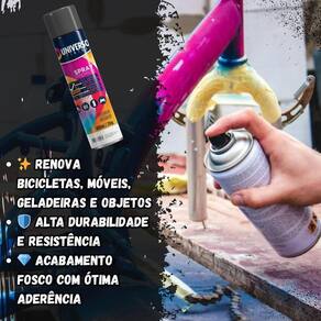 Tinta Spray 400ml Preto Fosco Uso Geral em Aço Ferro Couro Gesso Cerâmica A Tinta Spray 400ml Preto Fosco Uso Geral é a solução prática para renovar superfícies de metal, gesso, couro e cerâmica. Ideal para dar vida nova a bicicletas, móveis, eletrodomésticos e objetos em geral, garantindo um acabamento moderno e duradouro. Com fórmula de alta qualidade, oferece excelente aderência e acabamento Fosco, além de resistência superior contra desgastes do dia a dia. Sua cobertura uniforme realça os detalhes e proporciona um resultado em poucas camadas. Prática e fácil de aplicar, a tinta spray seca ao toque em apenas 15 minutos, permitindo agilidade nos trabalhos e economia de tempo. O rendimento de até 2 m por demão garante maior aproveitamento do produto e ótimo custo-benefício. Diferenciais: Acabamento Fosco com ótima aderência Alta durabilidade e resistência em ambientes internos e externos Secagem rápida e aplicação prática com cobertura uniforme Especificações TÉCNICAS: Volume: 400ml Rendimento: até 2 m por demão Superfícies indicadas: metal, gesso, couro e cerâmica Secagem: toque em 15 minutos Acabamento: Fosco Recomendação: uso de primer para melhor desempenho Itens INCLUSOS: 10 Tintas Spray 400ml Preto Fosco Uso Geral