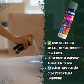 Tinta Spray 400ml Verde Escuro Uso Geral em Aço Ferro Couro Gesso Cerâmica A Tinta Spray 400ml Verde Escuro Uso Geral é a solução prática para renovar superfícies de metal, gesso, couro e cerâmica. Ideal para dar vida nova a bicicletas, móveis, eletrodomésticos e objetos em geral, garantindo um acabamento moderno e duradouro. Com fórmula de alta qualidade, oferece excelente aderência e acabamento Brilhante, além de resistência superior contra desgastes do dia a dia. Sua cobertura uniforme realça os detalhes e proporciona um resultado em poucas camadas. Prática e fácil de aplicar, a tinta spray seca ao toque em apenas 15 minutos, permitindo agilidade nos trabalhos e economia de tempo. O rendimento de até 2 m por demão garante maior aproveitamento do produto e ótimo custo-benefício. Diferenciais: Acabamento Brilhante com ótima aderência Alta durabilidade e resistência em ambientes internos e externos Secagem rápida e aplicação prática com cobertura uniforme Especificações TÉCNICAS: Volume: 400ml Rendimento: até 2 m por demão Superfícies indicadas: metal, gesso, couro e cerâmica Secagem: toque em 15 minutos Acabamento: Brilhante Recomendação: uso de primer para melhor desempenho Itens INCLUSOS: 10 Tintas Spray 400ml Verde Escuro Uso Geral Marca: Não Informado