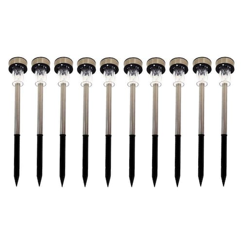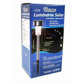 Kit 10 Luminárias Solares balizadoras para jardim, promove iluminação decorativa para jardim, entradas, caminhos e destaques a objetos. Marca: western Características: -painel Solar: Utiliza a luz solar para recarregar a bateria. -sensor Fotossensível: Acende automaticamente ao escurecer. -fácil de montar. -não utiliza fiação. -não consome energia elétrica. -1 LED Branco. -haste em aço inoxidável. -estaca. -resistente a água: Pode ficar na Chuva. Conteúdo: -10 Luminárias Solares Aplicação: ideal para decorar Jardins, entrada de residência, caminhos entre outros. Código: kit068 LS16 Marca: Não Informado Ean: 7898615913166