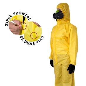 Macacão de segurança confeccionado em tecido não tecido (TNT) de polipropileno com uma camada laminada de polietileno, capuz de três peças com elástico, fechamento frontal com zíper bidirecional e aba protetora, elástico no punho para ajuste no dedo polegar, costuras seladas, elástico na cintura, punhos e tornozelos.