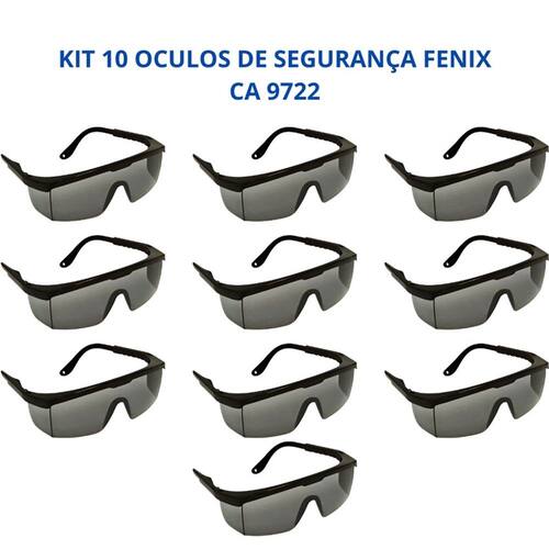 Kit 10 Óculos de Proteção Fênix CA 9722 Segurança e Conforto para Seus Olhos Os Óculos de Proteção Fênix são projetados para oferecer ampla proteção ocular em diversas atividades. Fabricados com lentes de policarbonato óptico de alta qualidade, possuem armação de nylon resistente e hastes com comprimento regulável, garantindo um ajuste confortável para diferentes formatos de rosto. As lentes filtram 99,9% dos raios UVA e UVB, assegurando proteção contra radiações nocivas.