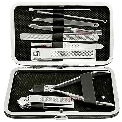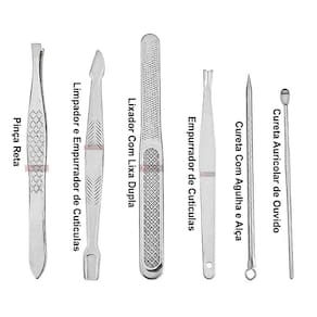 Conteúdo da Embalagem: 01 Cureta Extrator de Cravos e Espinhas com Agulha e Alça 01 Cureta Limpador de Ouvido Mimi Kaki Japonês 01 Espátula Raspador e Empurrador de Cutículas 01 Empurrador de Unha 01 Lixador de Unha Dupla Face em Inox 01 Cortador de Unha Grande (8 cm) 01 Cortador de Unha Lateral (45°) 01 Pinça Reta 01 Alicate de Cutícula 01 Estojo de Armazenamento