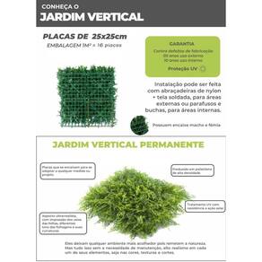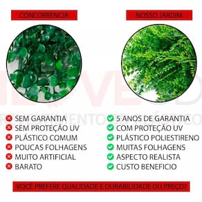 Kit 10 Placa Revestimento Parede Quadro Jardim Vertical Renove seu espaço com o Jardim Vertical Único com Proteção UV Peças 25x25cm, ideais para interiores e exteriores. Garantimos cores vibrantes sem desbotar. Possuem moldura ultra-flexível com conectores de intertravamento que facilitam a instalação - é só encaixar um painel no outro para montar lindos ambientes Os painéis verdes tem excelente durabilidade em ambientes externos por serem resistentes a variações climáticas. Também, não precisam de manutenção poda e irrigação . Material: Polietileno de Alta Densidade Dimensão da Placa: 25cm x 25cm Quantidade por Embalagem: 10 placa de 25cm x 25cm Uso: Interno e Externo Instalação: Abraçadeira Nylon Qualidade superior: Plantas permanentes que imitam perfeitamente as naturais, mantendo o visual fresco o ano todo. Durabilidade incrível: Superior a 10 e oferecemos 5 anos de de fábrica para áreas externas e 10 anos para internas. Proteção UV: Cores vibrantes que não desbotam, ideais para áreas internas e externas. Manutenção fácil: Sem necessidade de rega ou poda. Versatilidade: Fácil de instalar em qualquer superfície, adaptável a diversos ambientes. Sustentabilidade: Feito com materiais recicláveis e duráveis, uma escolha ecológica. Moldura ultra-flexível: Conectores de intertravamento para uma montagem simples e rápida. Fazem o encaixe perfeito uma na outra. Quantas placas preciso para cobrir 1m Resposta: Será necessario 16 placas para preencher a metragem de 1m. Como é feito a instalações Resposta: A instalação é feita com Abraçadeira de Nylon ou parafusos. Pode ser instalado na área externa Resposta: Sim, pode ser instalado na área interna e externa; A cobre quanto tempo Resposta: A cobre 5 anos para área externa e 10 anos para área interna porém a durabilidade é superior. Somos a Lujp Decorações, apaixonados por revestimentos e elementos 3D. Criamos ambientes únicos e inspiradores com foco na qualidade. Oferecemos uma variedade de produtos e serviços para transformar espaços e surpreender nossos clientes.