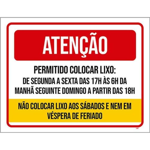 Kit 10 Placas Atenção Permitido Colocar Lixo Sábados 36x46 Placas de sinalizaço fabricadas com poliestireno de alto impacto PSAI de 2mm e impressão ultravioleta.